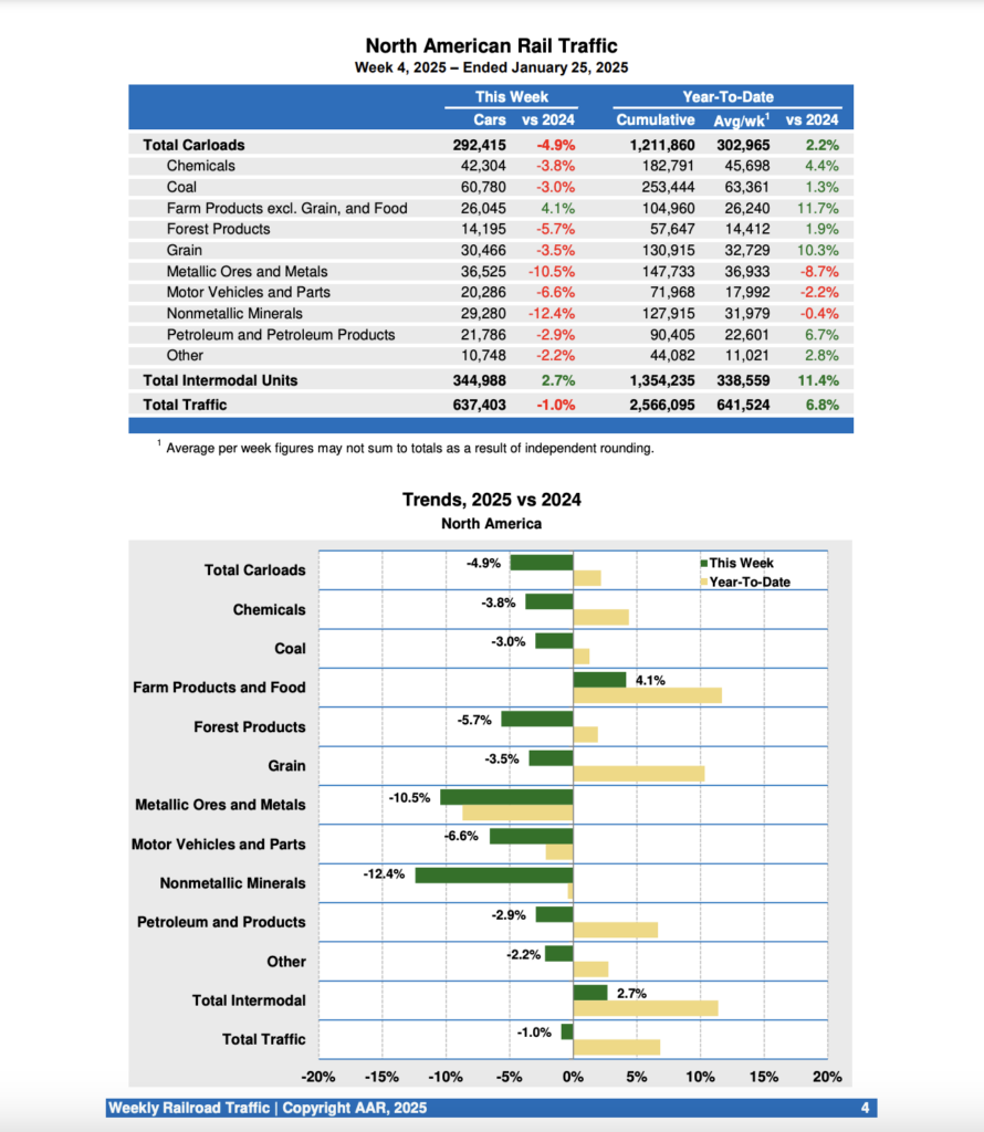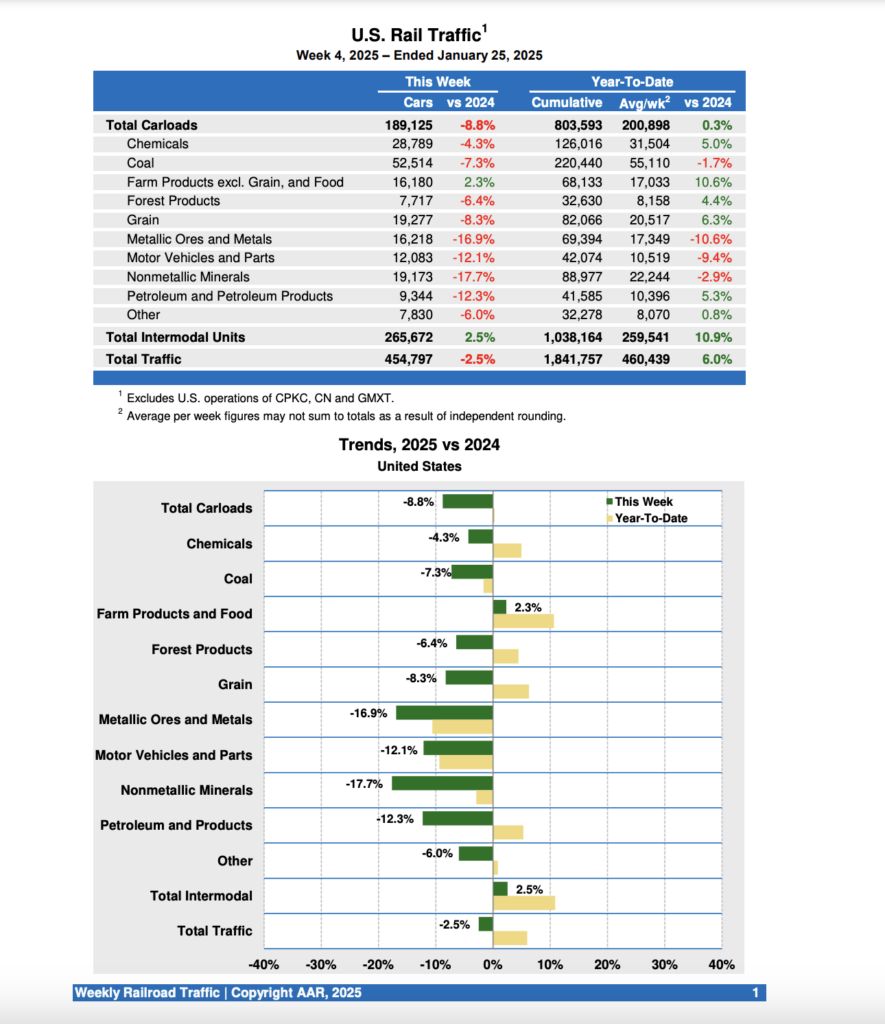 According to the AAR, U.S. Class I railroads hauled 454,797 carloads and intermodal units for the week ending Jan. 25, 2025, a 2.5% decrease over the same week last year. That comprised 189,125 carloads, down 8.8% from 2024, and 265,672 containers and trailers, up 2.5% from last year.
