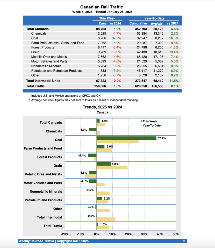 Canadian railroads reported 88,763 carloads for the week ending Jan. 25, 2025, a 1.9% increase, and 67,323 intermodal units, a 0.2% decrease over the same week last year.