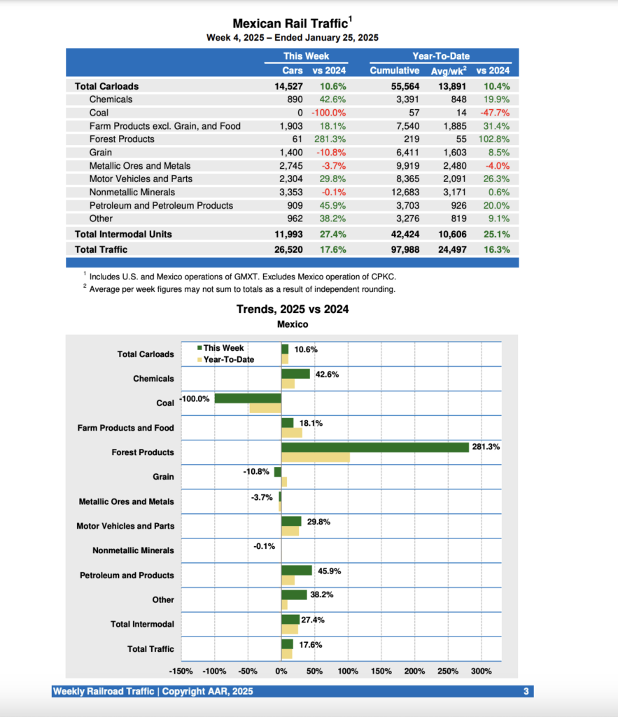 Mexican railroads reported 14,527 carloads for the week ending Jan. 25, 2025, up 10.6% compared with the same week last year, and 11,933 intermodal units, up 27.4%.