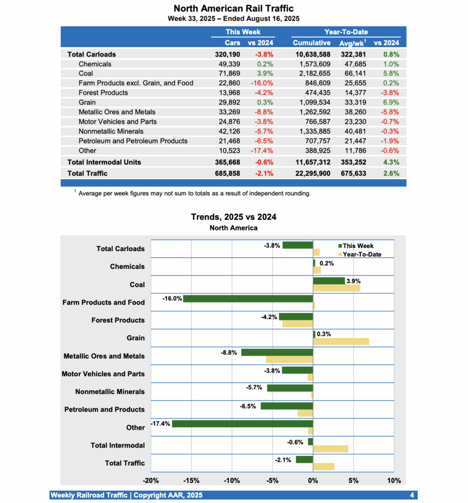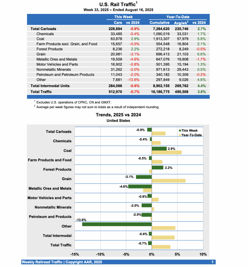 Total U.S. weekly rail traffic for the week ending Aug. 16, 2025 (Week 33) came in at 512,970 carloads and intermodal units, down 0.7% from the same week in 2024, the Association of American Railroads (AAR) reported Aug. 20.