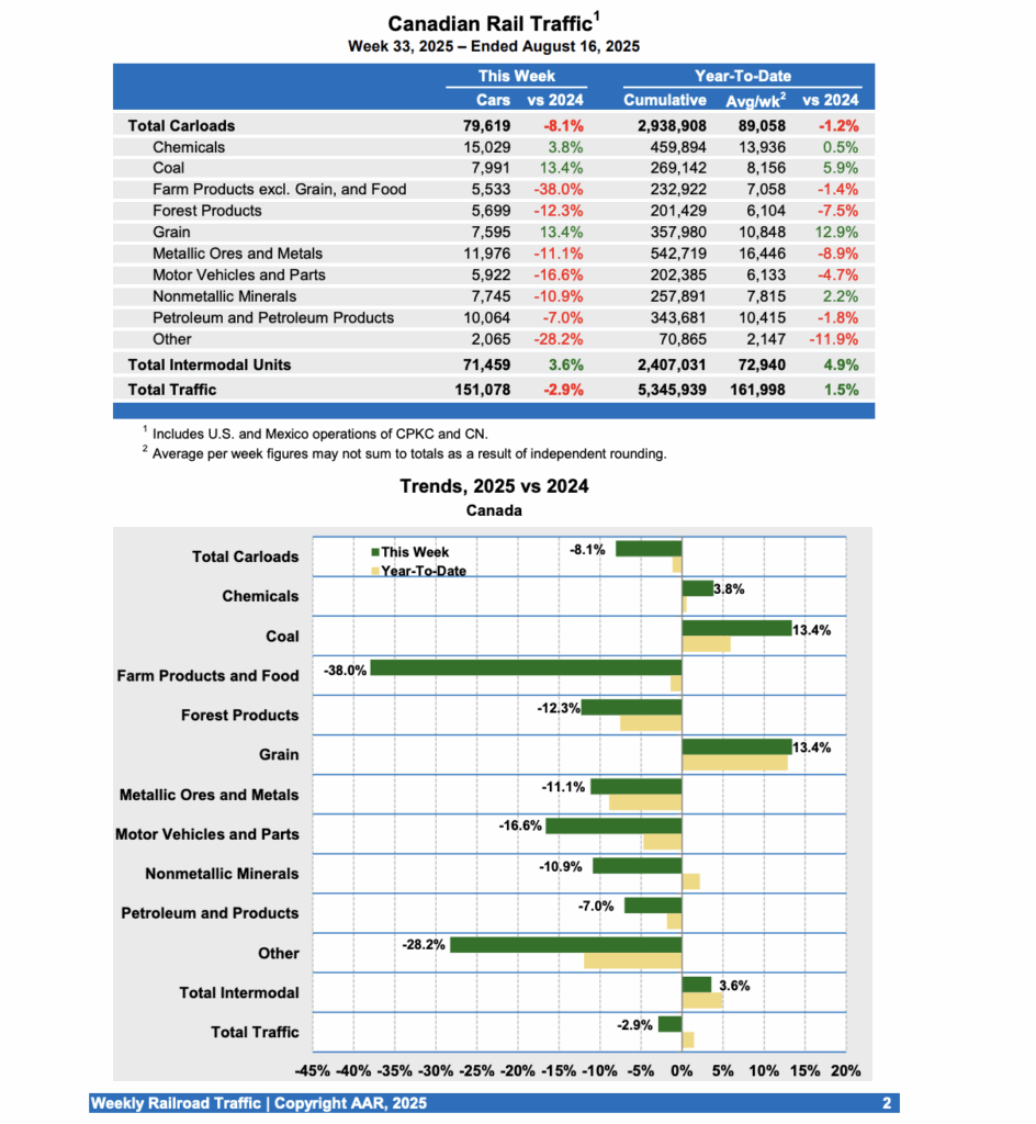 Canadian railroads reported 79,619 carloads for the week, down 8.1%, and 71,459 intermodal units, up 3.6% compared with the same week in 2024. For the first 33 weeks of 2025, Canadian railroads reported cumulative rail traffic volume of 5,345,939 carloads, containers and trailers, up 1.5%.