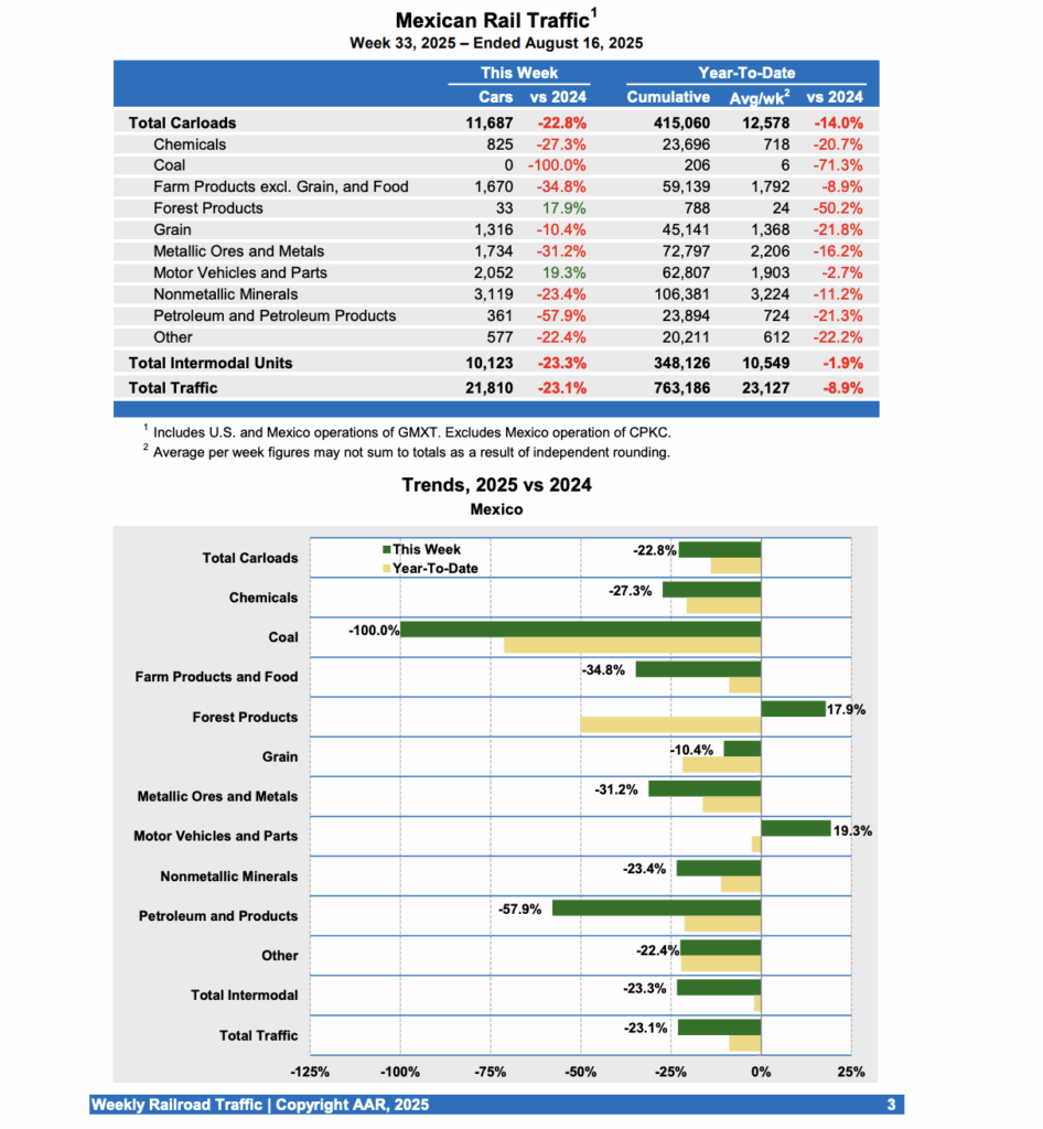 Mexican railroads reported 11,687 carloads for the week, down 22.8% compared with the same week last year, and 10,123 intermodal units, down 23.3%. Cumulative volume on Mexican railroads for the first 33 weeks of 2025 was 763,186 carloads and intermodal containers and trailers, down 8.9% from the same point last year.