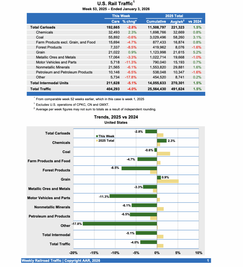 The Association of American Railroads (AAR) on Jan. 8 reported that total originated U.S. rail traffic was 404,293 carloads and intermodal units for the week ending Jan. 3, 2026, down 4.0%, from the comparable year-earlier week, which in this case is Week 1 of 2025.