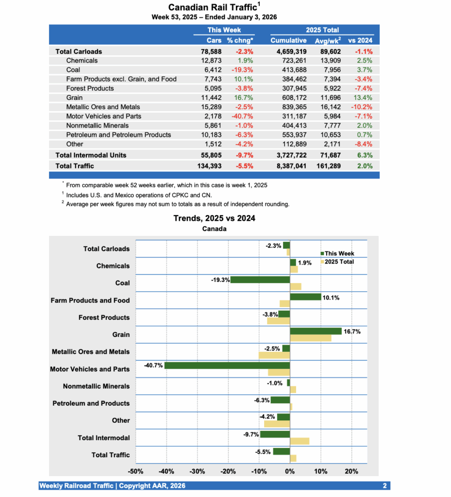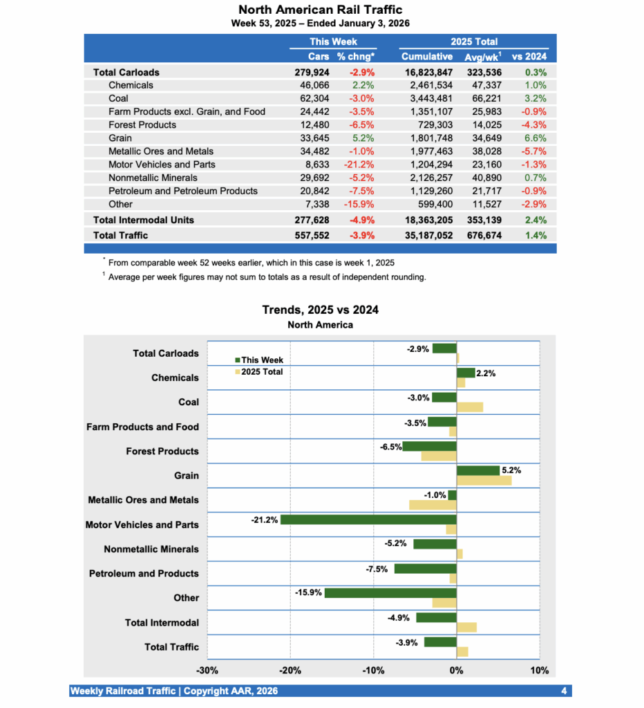 Editor’s Note: For rail traffic purposes, a week that bridges two different years is assigned to the year in which most of the days of that week fall. The week ending Jan. 3, 2026, had most of its days in 2025, so it is assigned to 2025. Because of the way the calendar fell in 2025, the week ending Jan. 3, 2026, was week 53 of 2025. A year having 53 weeks happens every few years. Rail traffic comparisons are always made to the corresponding period 52 weeks earlier. This means the comparison week for a week 53 is Week 1 of the same year. To ensure comparability across years, Week 53 is ignored when computing annual totals. Instead, annual totals are always weeks 1-52.