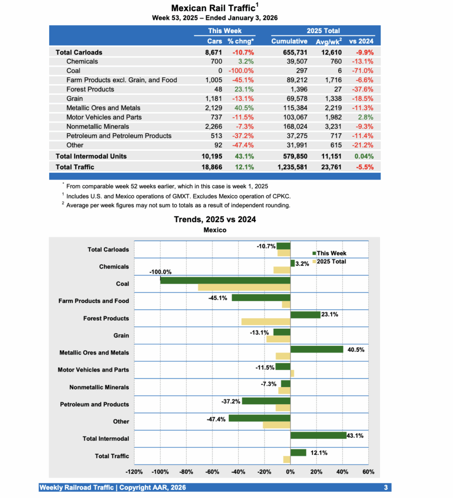 For the week ending Jan. 3, 2026, Mexican railroads reported 8,671 carloads, down 10.7% from the comparison week, and 10,195 intermodal units, up 43.1%. Cumulative volume on Mexican railroads for 2025 was 1,235,581 carloads and intermodal containers and trailers, down 5.5% from 2024.