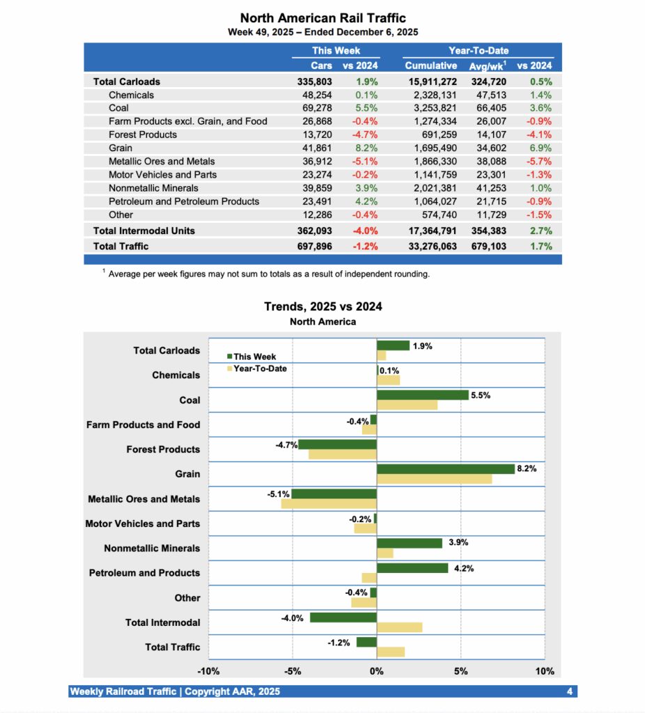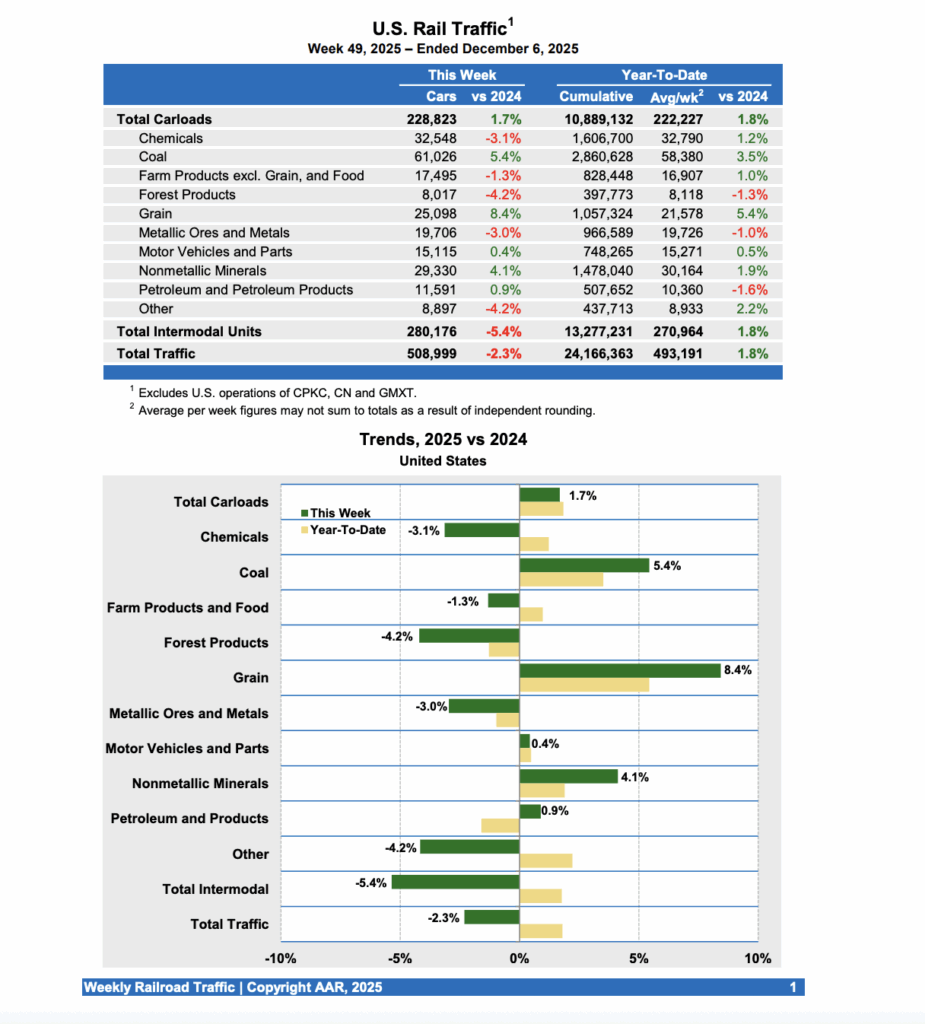 For the first 49 weeks of 2025, U.S. railroads reported cumulative volume of 10,889,132 carloads, rising 1.8% from the prior-year period; and 13,277,231 intermodal units, increasing 1.8% from last year. Total combined U.S. traffic for the first 49 weeks of this year was 24,166,363 carloads and intermodal units, a 1.8% gain over 2024.