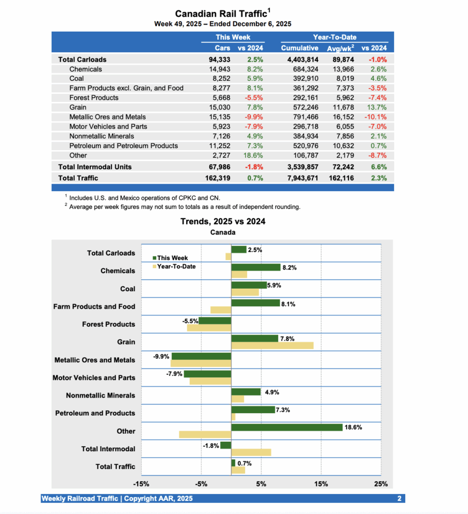 For the week ending Dec. 6, 2025, Canadian railroads reported 94,333 carloads, rising 2.5%, and 67,986 intermodal units, down 1.8% from the prior-year period. For the first 49 weeks of this year, they reported cumulative rail traffic volume of 7,943,671 carloads, containers, and trailers, up 2.3%.