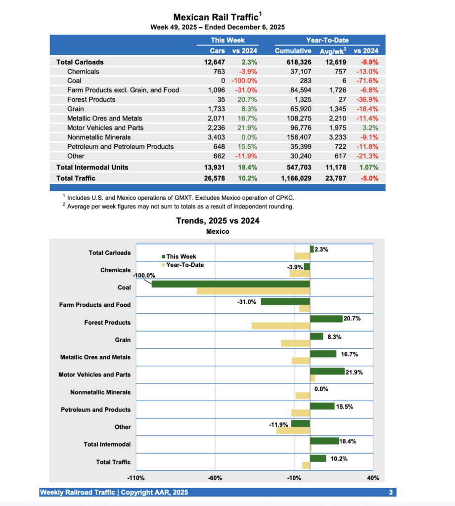Mexican railroads reported 12,647 carloads for the week ending Dec. 6, 2025, up 2.3% from the same week last year, and 13,931 intermodal units, an increase of 18.4%. Their cumulative volume for the first 49 weeks of this year was 1,166,029 carloads and intermodal containers and trailers, down 5.0% from the same point in 2024.
