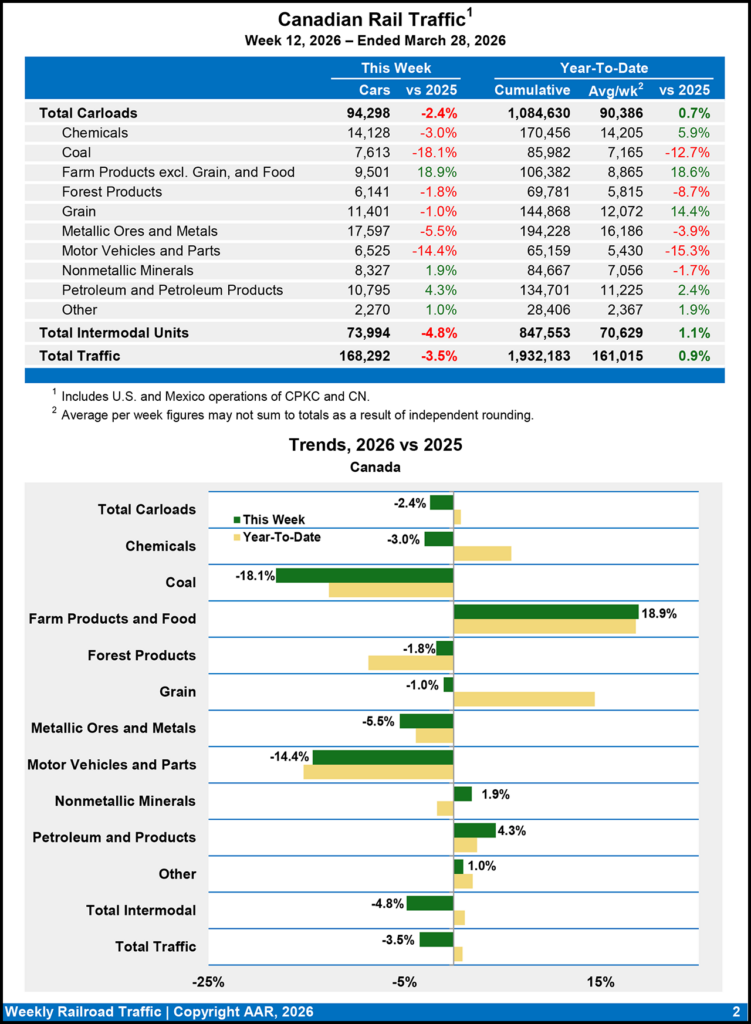 For the week ending March 28, 2026, Canadian railroads reported 94,298 carloads, falling 2.4%, and 73,994 intermodal units, dropping 4.8% compared with the same week in 2025. For the first 12 weeks of this year, they reported cumulative rail traffic volume of 1,932,183 carloads, containers, and trailers, up 0.9%.