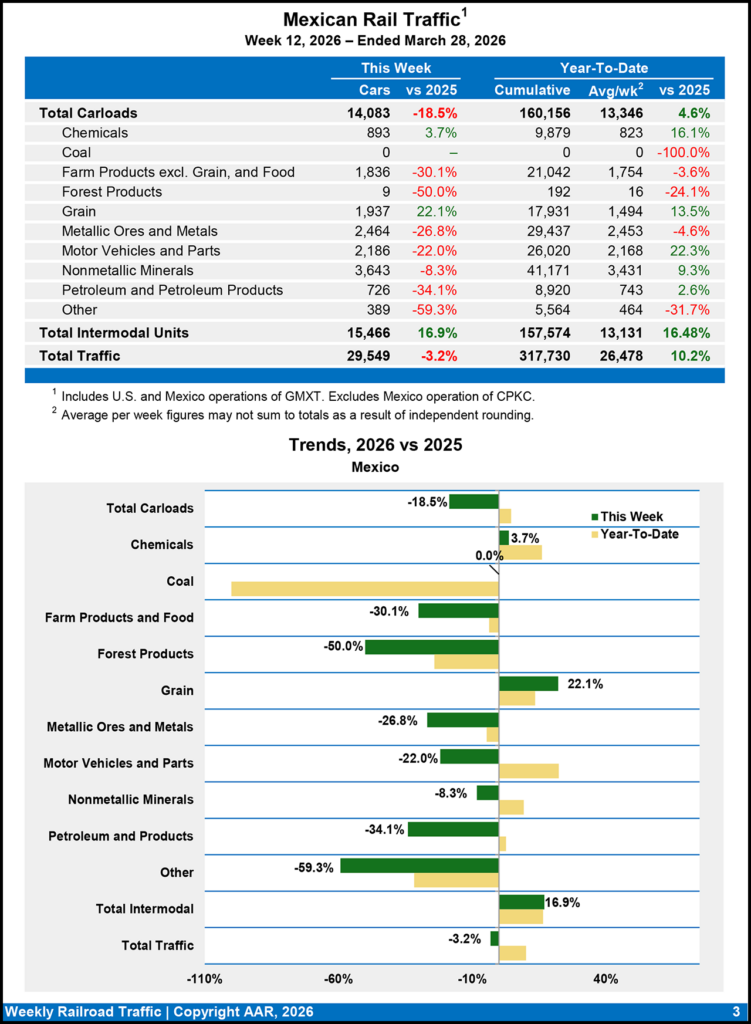 Mexican railroads reported 14,083 carloads for the week ending March 28, 2026, an 18.5% decrease compared with the same week last year, and 15,466 intermodal units, a 16.9% gain over last year. Their cumulative volume for the first 12 weeks of this year was 317,730 carloads and intermodal containers and trailers, rising 10.2% from the same point in 2025.