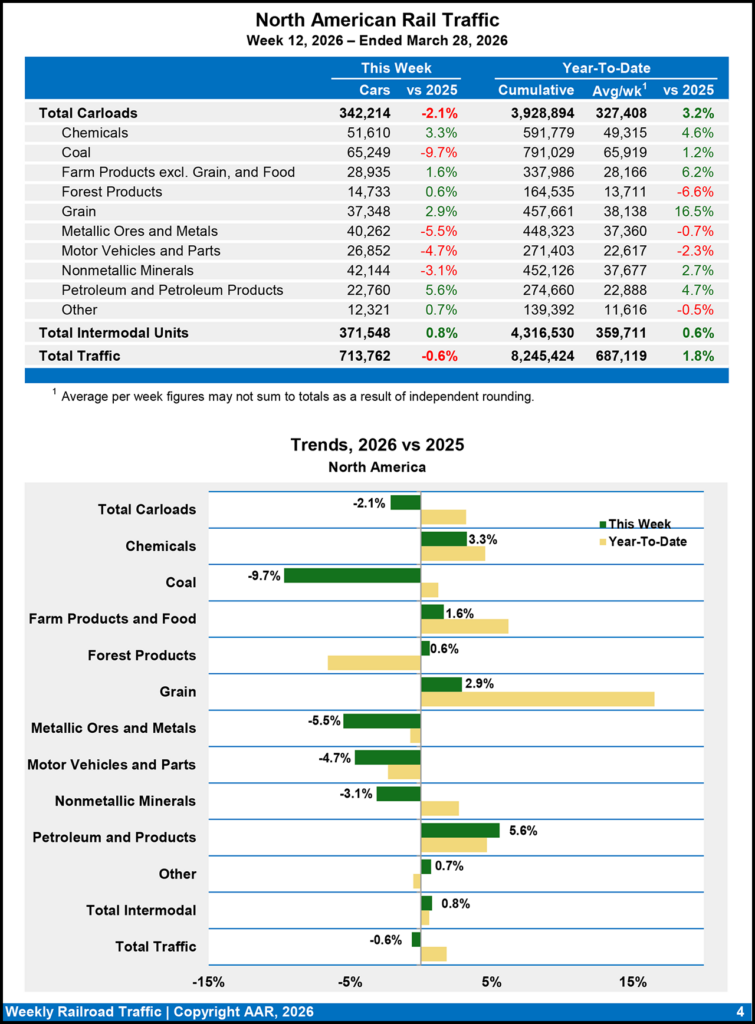 North American rail volume for the week ending March 28, 2026, on nine reporting U.S., Canadian, and Mexican railroads totaled 342,214 carloads, dipping 2.1% from the same week last year, and 371,548 intermodal units, gaining 0.8% over last year. Total combined weekly rail traffic in North America came in at 713,762 carloads and intermodal units, down 0.6%. North American rail volume for the first 12 weeks of this year was 8,245,424 carloads and intermodal units, up 1.8% from 2025.