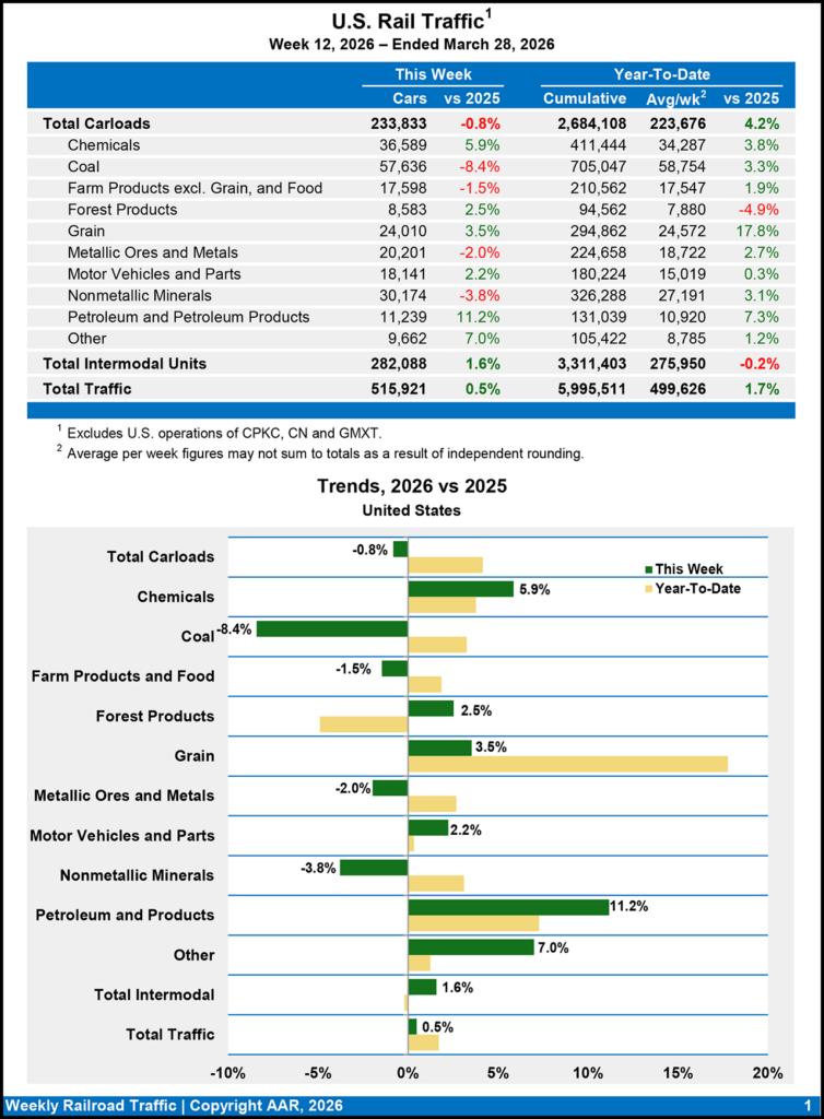 Total carloads for the week ending March 28, 2026, were 233,833 carloads, down 0.8% from the prior-year period, while U.S. weekly intermodal volume was 282,088 containers and trailers, up 1.6% from last year, according to the AAR.