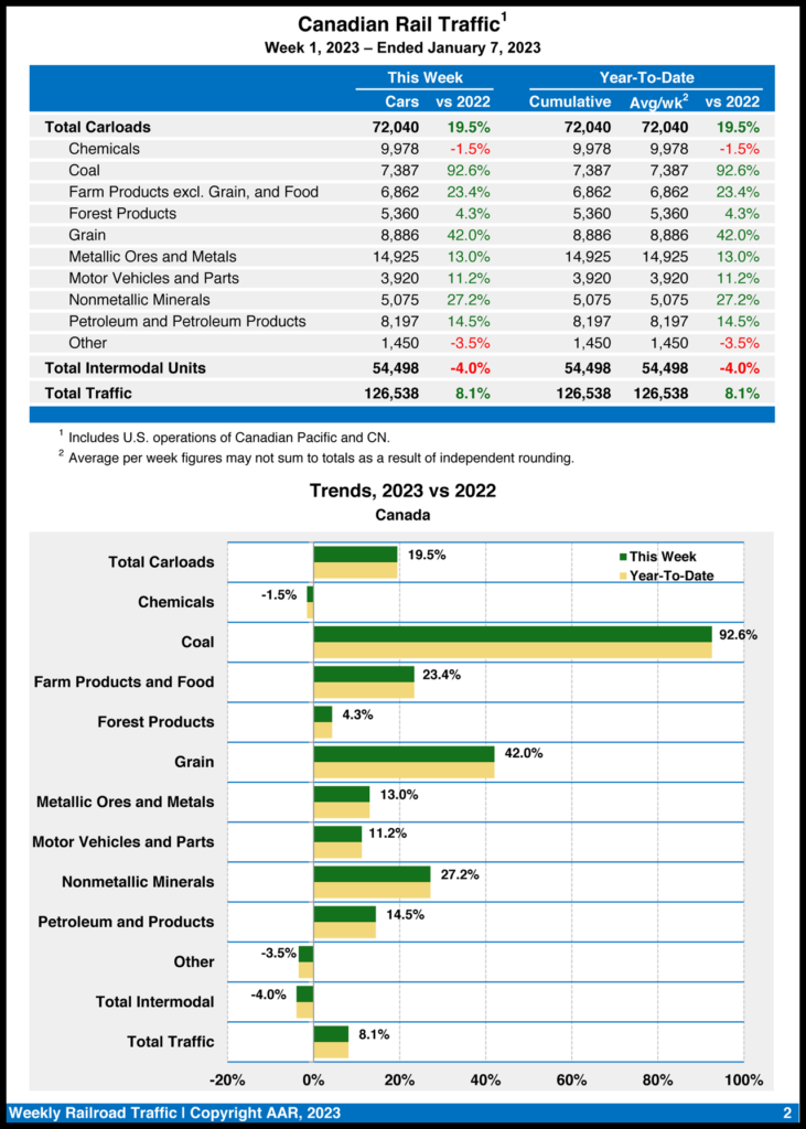 Canadian railroads reported 72,040 carloads for the week ending Jan. 7, 2023, rising 19.5%, and 54,498 intermodal units, falling 4.0% from the same week in 2022. For the first week of 2023, they reported cumulative rail traffic volume of 126,538 carloads, containers and trailers, increasing 8.1%.
