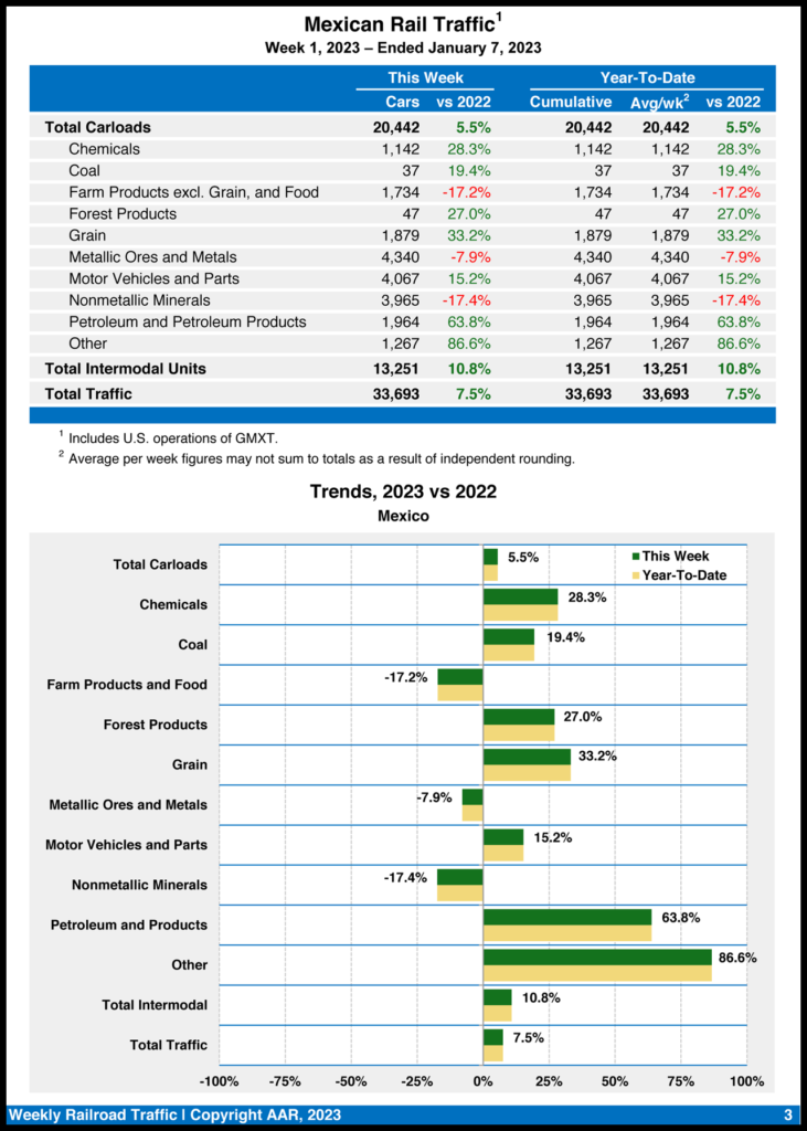 Mexican railroads reported 20,442 carloads for the week ending Jan. 7, 2023, up 5.5% from the same point last year, and 13,251 intermodal units, up 10.8%. Their cumulative volume for the first week of 2023 was 33,693 carloads and intermodal containers and trailers, up 7.5% from the year-ago period.