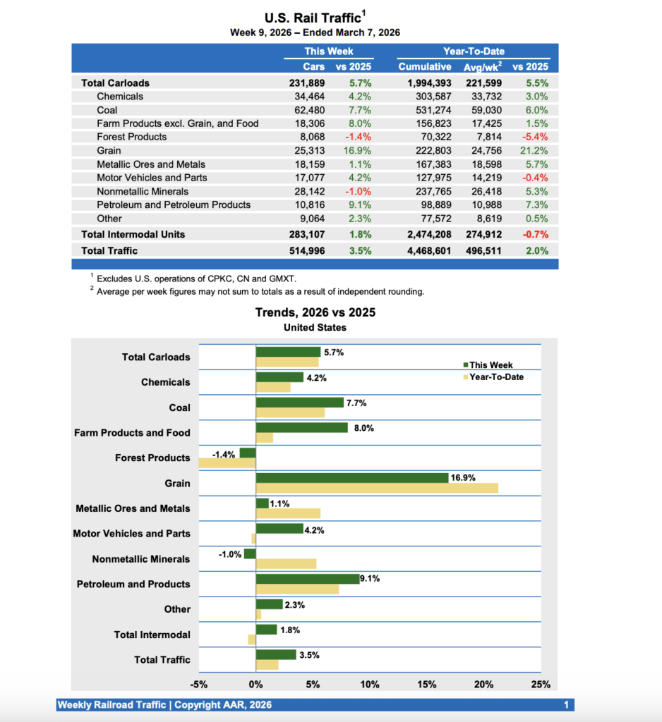 For the week ending March 7, 2026, total U.S. rail traffic rose 3.5% from the same point last year, marking the fourth consecutive week of traffic upticks, according to the Association of American Railroads’ (AAR) latest report.