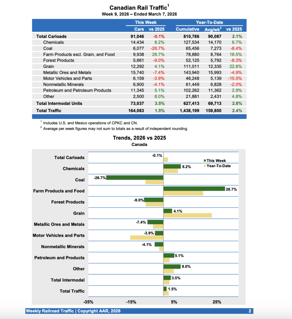 Canadian railroads reported 91,046 carloads for the week ending March 7, 2026, down 0.1%, and 73,037 intermodal units, up 3.5% compared with the same week last year. For the first nine weeks of 2026, they reported cumulative rail traffic volume of 1,438,199 carloads, containers, and trailers, up 2.4%.
