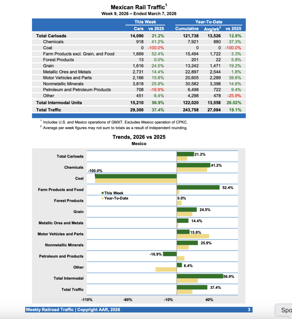Mexican railroads reported 14,090 carloads for the week ending March 7, 2026, rising 21.2% from the same point last year, and 15,210 intermodal units, up 56.9%. Their cumulative volume for the first nine weeks of this year came in at 243,758 carloads and intermodal containers and trailers, increasing 19.1% from the same point last year.
