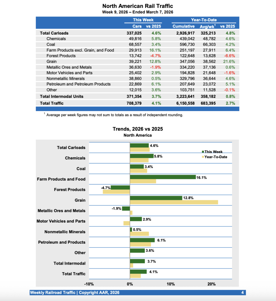 North American rail volume for the week ending March 7, 2026, on nine reporting U.S., Canadian, and Mexican railroads totaled 337,025 carloads, up 4.6% from the same week last year, and 371,354 intermodal units, up 3.7% from last year. Total combined weekly rail traffic in North America came in at 708,379 carloads and intermodal units, up 4.1%. North American rail volume for the first nine weeks of this year was 6,150,558 carloads and intermodal units, up 2.7% from 2025.