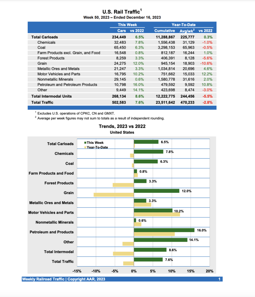 Total rail traffic for the week ending Dec. 16, 2023, comprised 234,449 carloads, up 6.5% from 2022, and 268,134 containers and trailers, up 8.6% from the same week last year, according to AAR.