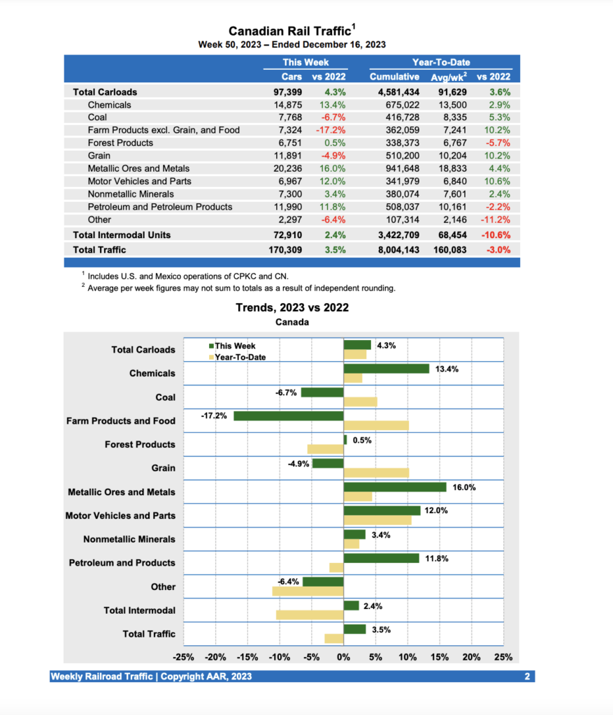 For the week ending Dec. 16, 2023, Canadian railroads reported 97,399 carloads, up 4.3%, and 72,910 intermodal units, up 2.4% compared with the same point last year. For the first 50 weeks of 2023, they reported cumulative rail traffic volume of 8,004,143 carloads, containers and trailers, down 0.3%.