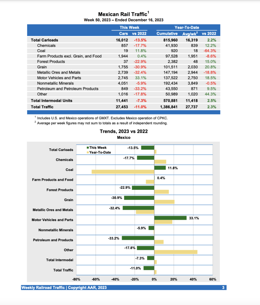 For the week ending Dec. 16, 2023, Mexican railroads reported 16,012 carloads, dropping 13.5% compared with the same week last year, and 11,441 intermodal units, decreasing 7.3%. For the first 50 weeks of 2023, they reported cumulative rail traffic volume of 1,386,841 carloads and intermodal containers and trailers, up 2.3% from the same point last year.