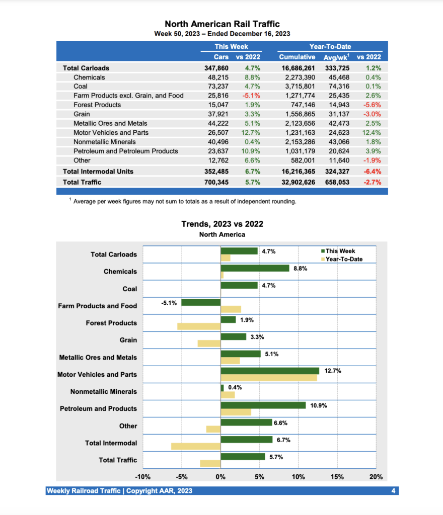 North American rail volume for the first 50 weeks of this year (ending Dec. 16) on 12 reporting U.S., Canadian and Mexican railroads totaled 347,860 carloads, an increase of 4.7% compared with the same week last year, and 352,485 intermodal units, up 6.7% percent. Total combined weekly rail traffic in North America was 700,345 carloads and intermodal units, up 5.7%. North American rail volume for the first 50 weeks of 2023 came in at 32,902,626 carloads and intermodal units, down 2.7% compared with 2022.