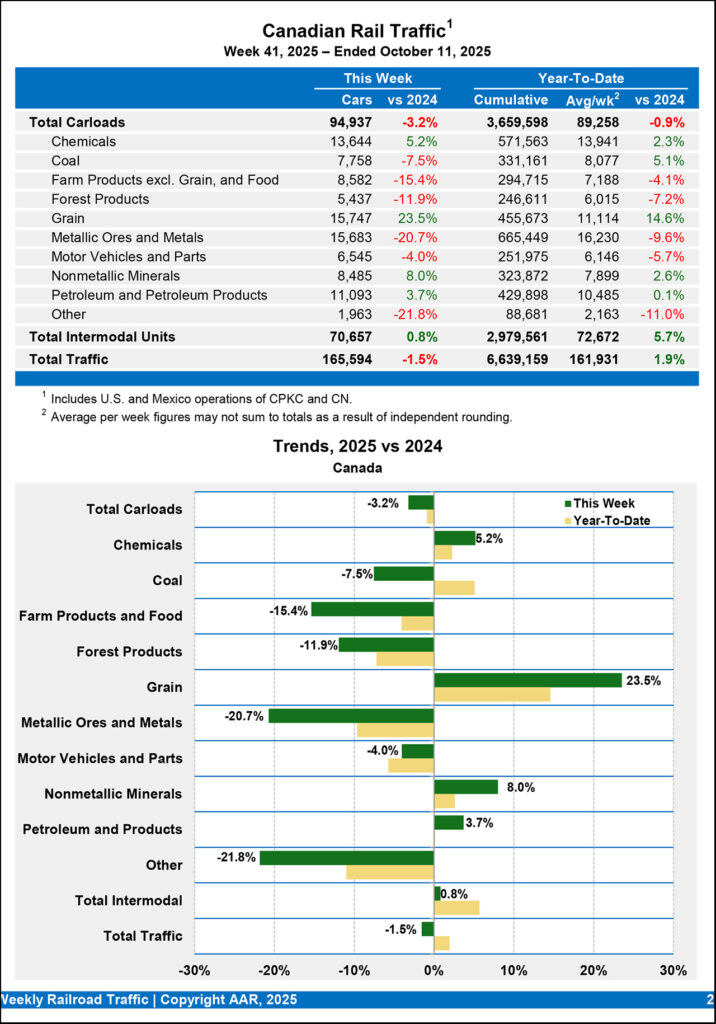 Canadian railroads reported 94,937 carloads for the week, down 3.2%, and 70,657 intermodal units, up 0.8% compared with the same week in 2024. For the first 41 weeks of 2025, Canadian railroads reported cumulative rail traffic volume of 6,639,159 carloads, containers and trailers, up 1.9%.