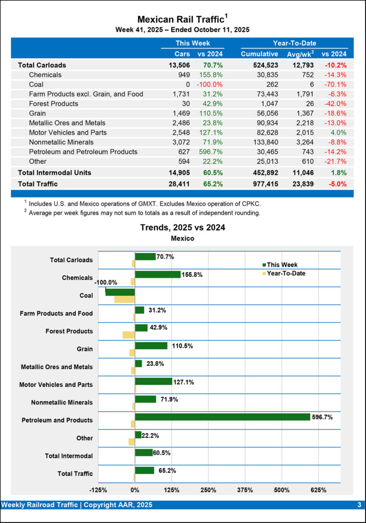 Mexican railroads reported 13,506 carloads for the week, up 70.7% compared with the same week last year, and 14,905 intermodal units, up 60.5%. Cumulative volume on Mexican railroads for the first 41 weeks of 2025 was 977,415 carloads and intermodal containers and trailers, down 5.0% from the same point last year.