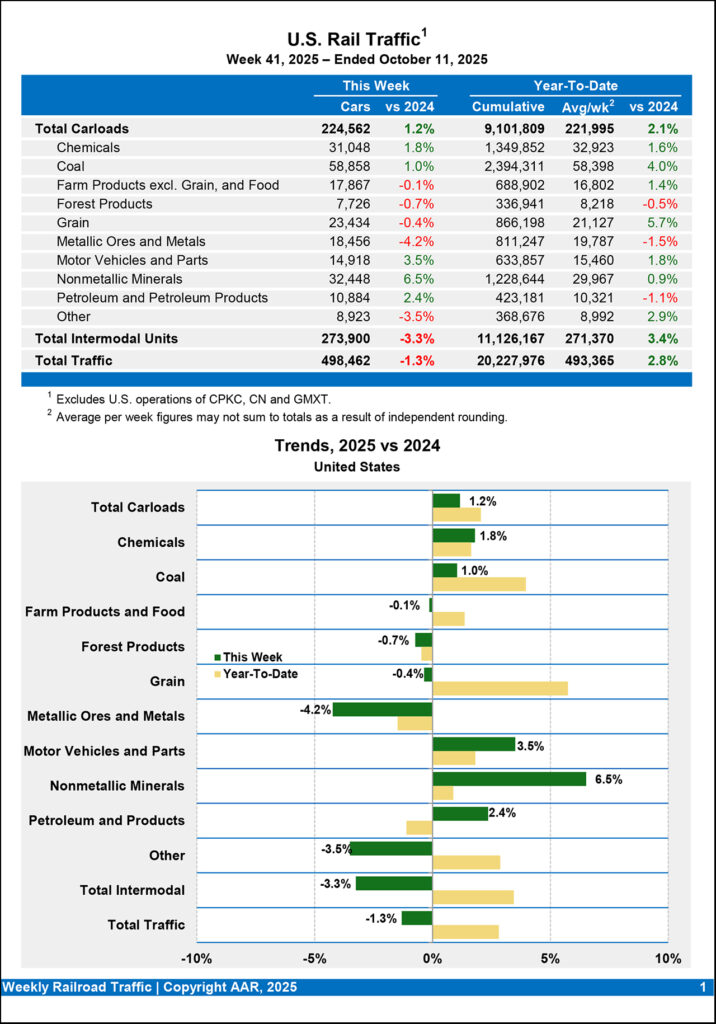 For the first 41 weeks of 2025, U.S. railroads reported cumulative volume of 9,101,809 carloads, up 2.1% from the same point last year; and 11,126,167 intermodal units, up 3.4% from last year. Total combined U.S. traffic for the first 41 weeks of 2025 was 20,227,976 carloads and intermodal units, an increase of 2.8% compared to last year.