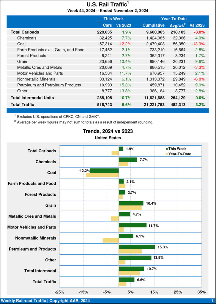 U.S. weekly rail traffic rose 6.6% to 516,743 carloads and intermodal units for the week ending Nov. 2, 2024, compared with the same week last year, the Association of American Railroads (AAR) reported Nov. 6.