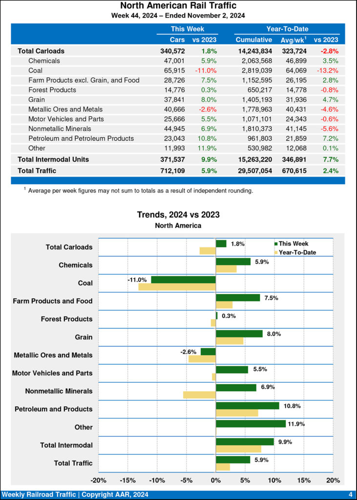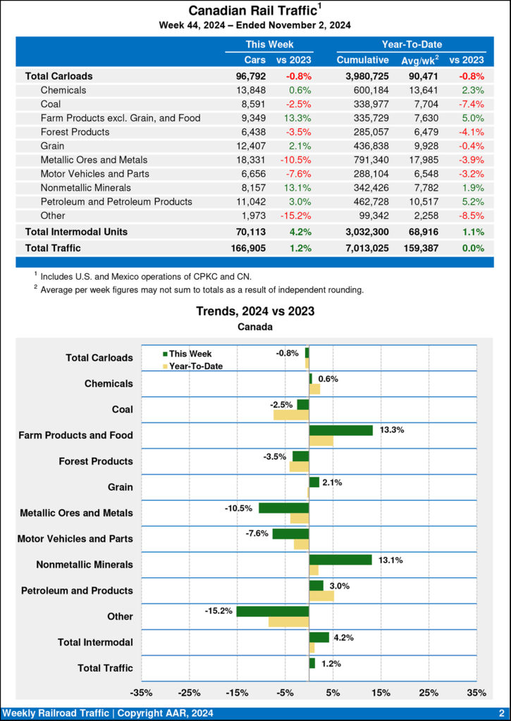 Canadian railroads reported 96,792 carloads for the week, down 0.8%, and 70,113 intermodal units, up 4.2% compared with the same week in 2023. For the first 44 weeks of 2024, Canadian railroads reported cumulative rail traffic volume of 7,013,025 carloads, containers and trailers, up 0.0%.