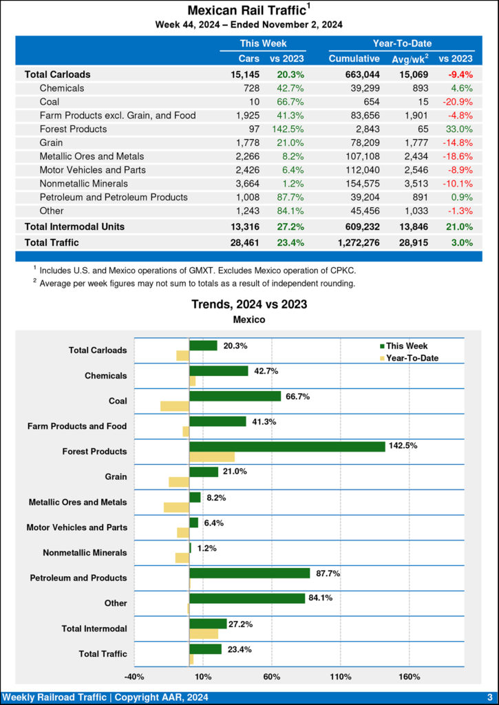 Mexican railroads reported 15,145 carloads for the week, up 20.3% compared with the same week last year, and 13,316 intermodal units, up 27.2%. Cumulative volume on Mexican railroads for the first 44 weeks of 2024 was 1,272,276 carloads and intermodal containers and trailers, up 3.0% from the same point last year.