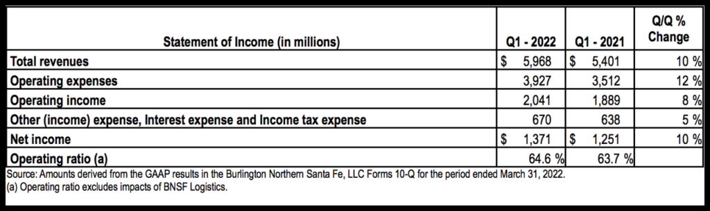 Operating expenses for the quarter rose 12% from the 2021 period. BNSF said a “significant portion” of the increase is due compensation and benefits expense increasing 5%, “primarily due to wage inflation, health and welfare costs, and lower productivity”; fuel expense increasing 57%, “primarily due to higher average fuel prices” (locomotive fuel price per gallon “increased at a similar rate in the first quarter of 2022 compared to the same period in 2021”); and materials and other expenses increasing 8%, “primarily due to increased general inflation and higher casualty costs.” There were “no significant changes in purchased services, depreciation and amortization, equipment rents or interest expense,” BNSF reported.