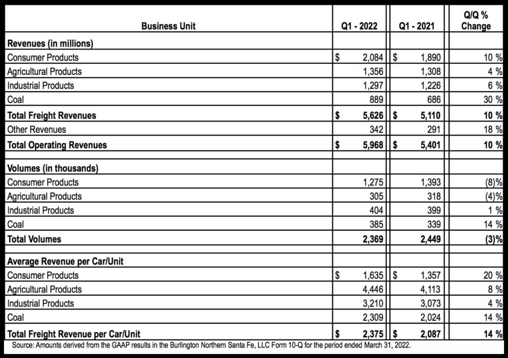 BNSF said the first-quarter 2022 revenue gain was “primarily due to a 14% increase in average revenue per car/unit resulting from higher fuel surcharge revenue driven by higher fuel prices along with increased rates per car, partially offset by a 3% decrease in unit volume.”