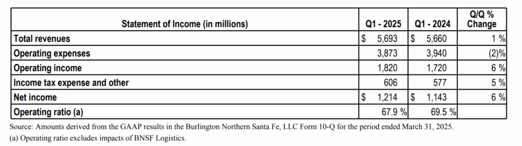 BNSF on May 5 released first-quarter 2025 results, including operating income of $1.8 billion, a 6% increase from the prior-year period’s $1.720 billion, and an operating ratio (OR) of 67.9%, a 1.6% decrease compared to 2024’s 69.5%.