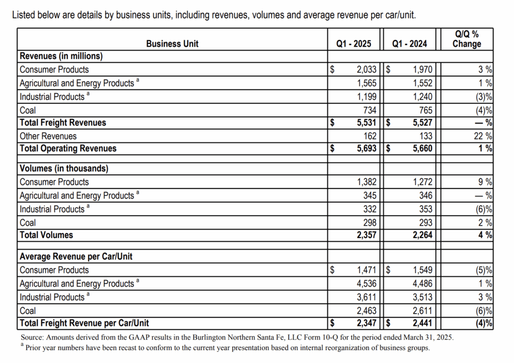 - “Consumer Products volumes increased 9% in the first quarter of 2025 compared to 2024 primarily due to higher intermodal shipments resulting from increased west coast imports, along with an increase in automotive volume from higher vehicle production.