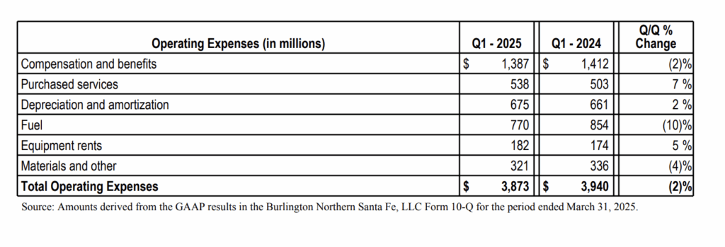BNSF’s operating expenses for first-quarter 2025 came in at $3.873 billion, down 2% from the prior-year period’s $3.940 billion. The railroad attributed a “significant portion” of the decline due to the following factors: