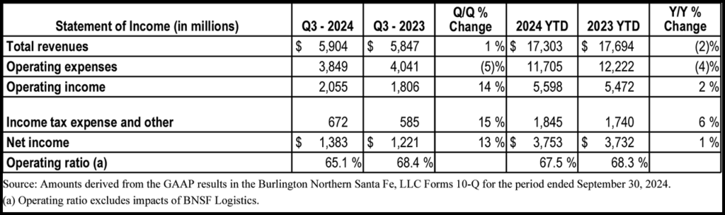 For third-quarter 2024, BNSF reported that total revenue rose 1% and net earnings were up 13% over the prior-year period, with volumes coming in 8% higher than the same period last year.
