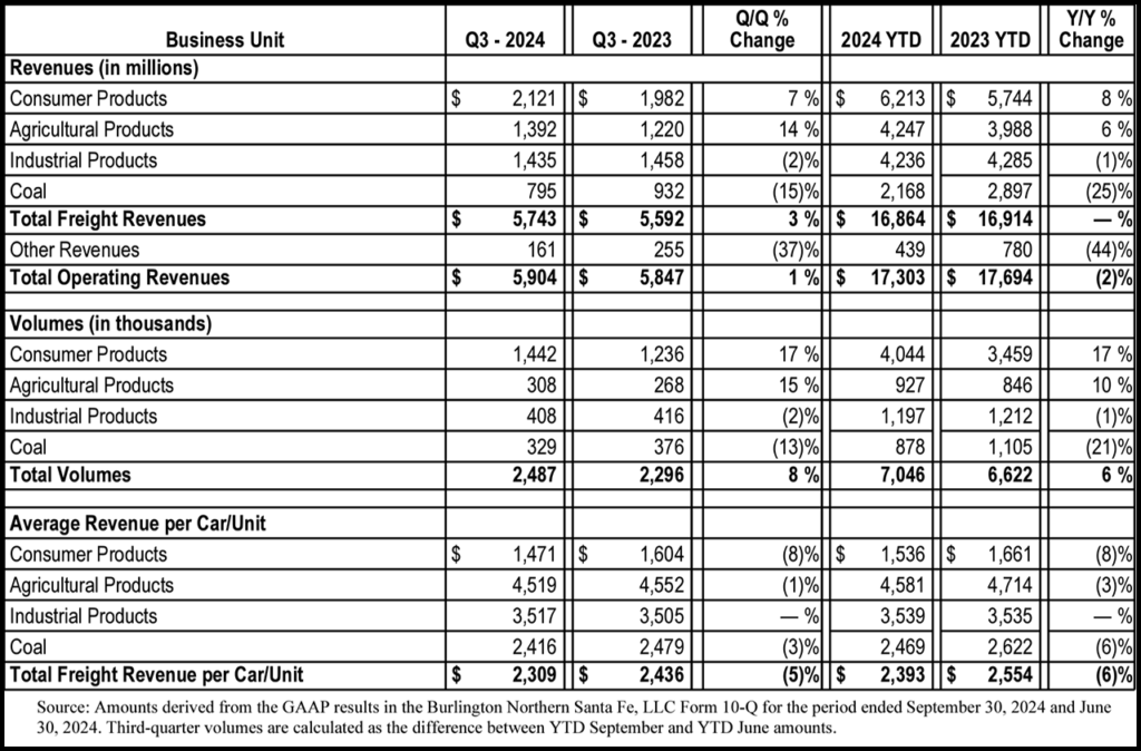 • Consumer Products volumes increased 17% in both the third quarter and first nine months of 2024 compared with the same periods in 2023, “primarily due to higher intermodal shipments from west coast imports and volumes from a new intermodal customer.”