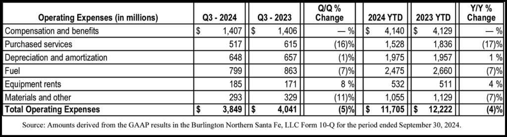 • Purchased services expense decreased 16% and 17% in the third quarter and first nine months of 2024, respectively, compared with 2023, “primarily due to lower purchased transportation driven by the sale of brokerage operations of BNSF Logistics, LLC and lower purchased services expense from Montana Rail Link, Inc.