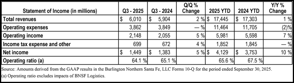 BNSF 3Q25: Revenue, Volume Up, OR Down