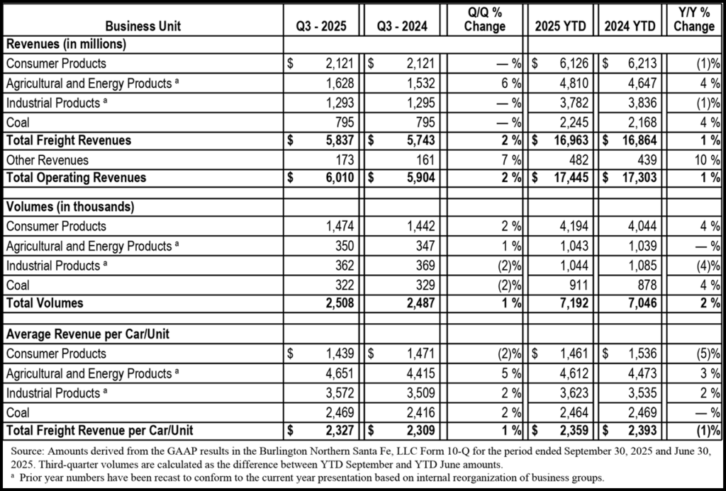 - Consumer Products volumes increased 2% and 4%, respectively, in the third quarter and first nine months of 2025 compared with the same periods in 2024, “primarily due to higher intermodal shipments resulting from increased west coast imports and increased automotive volume from higher vehicle production.”