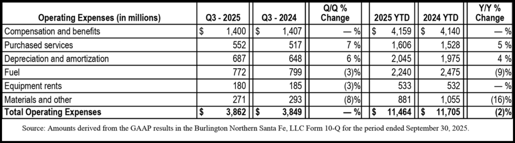 BNSF reported that operating expenses for the third quarter increased slightly while decreasing 2% in the first nine months of 2025 compared with the same periods in 2024, predominantly due to the following factors: