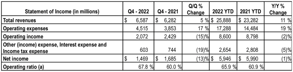 Operating expenses for fourth-quarter and full-year 2022 were up 17% and 19%, respectively, from the 2021 periods. This “reflected significant increases in the cost of fuel, as well as higher compensation and benefits expenses,” BNSF reported.