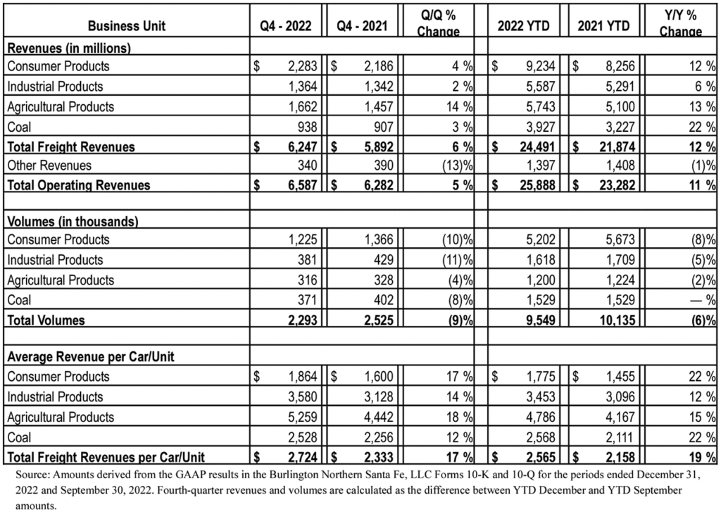 - Agricultural Products volumes decreasing 4% for fourth-quarter and 2% for full-year 2022, compared with 2021. These changes reflect, primarily, “lower grain exports and fertilizer shipments, partially offset by higher volumes of domestic grains, renewable diesel, and feedstocks,” according to BNSF.