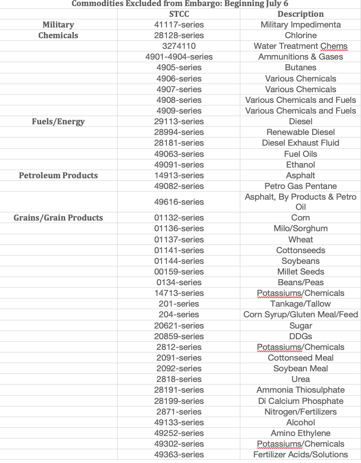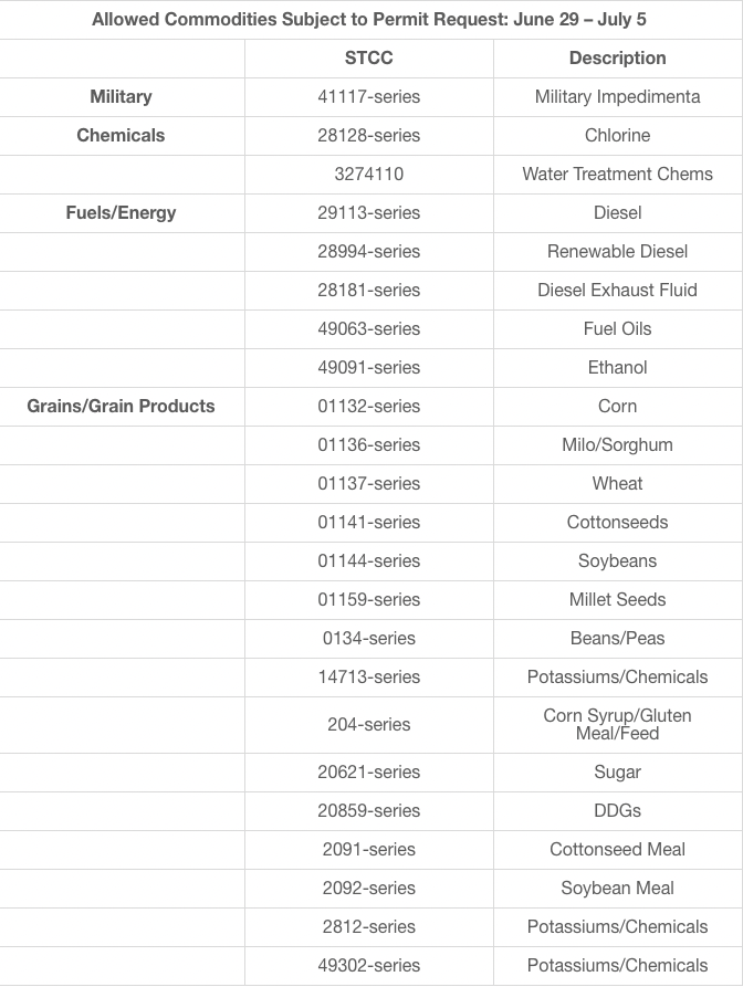For the week of June 29 to July 5, BNSF will consider issuing permits to embargoed destinations for the commodities listed above.