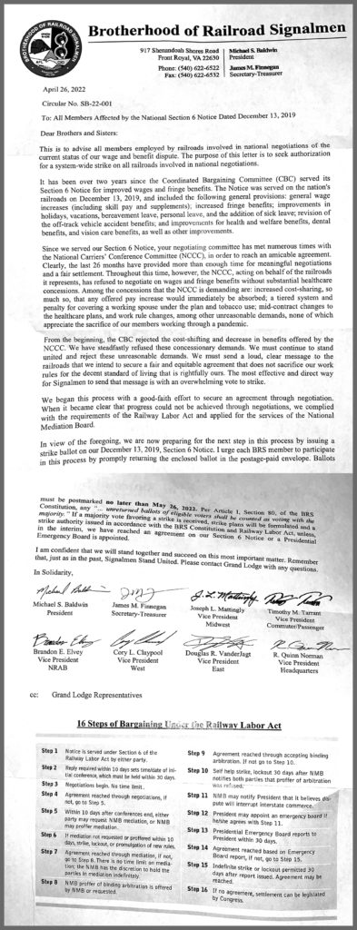 “The purpose of this letter (below) is to seek authorization for a system-wide strike on all railroads involved in national negotiations … We must send a loud, clear message to the railroads that we intend to secure a fair and equitable agreement that does not sacrifice our work rules for the decent standard of living that is rightfully ours,” the letter states. “The most effective and direct way for Signalmen to send that message is with an overwhelming vote to strike.”
