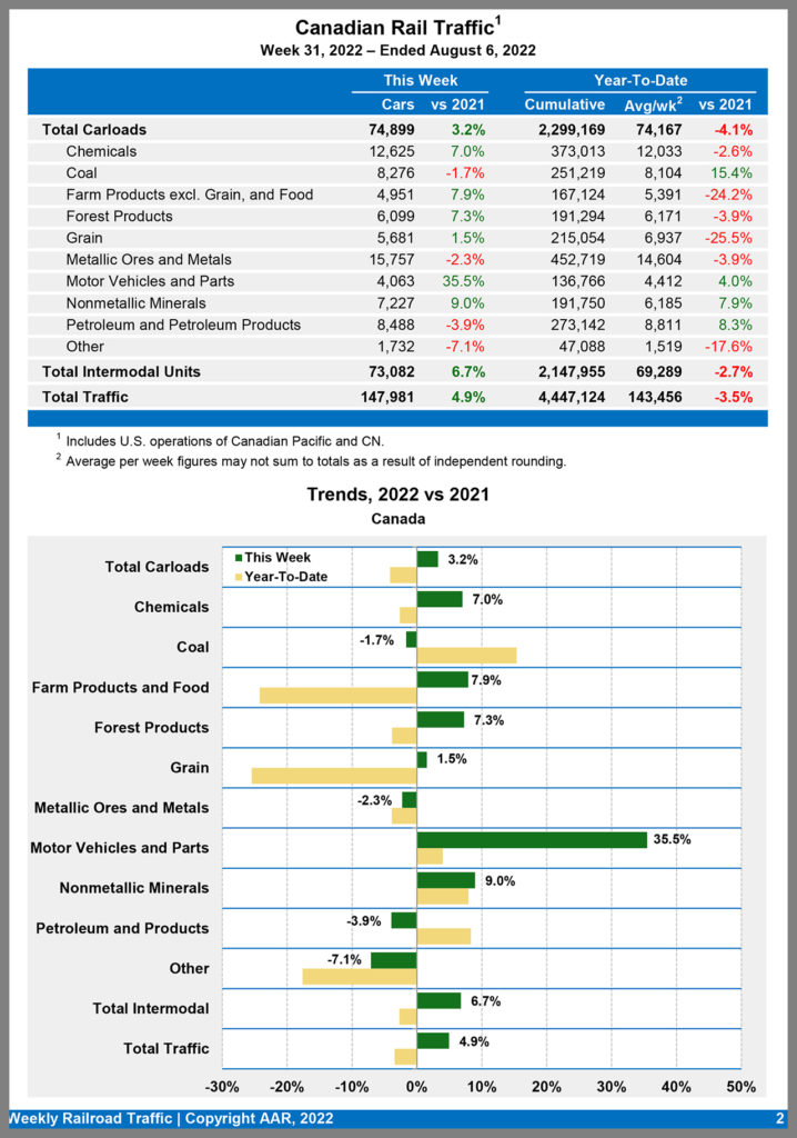 Canadian railroads reported 74,899 carloads for the week, up 3.2%, and 73,082 intermodal units, up 6.7%, compared with the same week in 2021. For the first 31 weeks of 2022, Canadian railroads reported cumulative rail traffic volume of 4,447,124 carloads, containers and trailers, down 3.5%.
