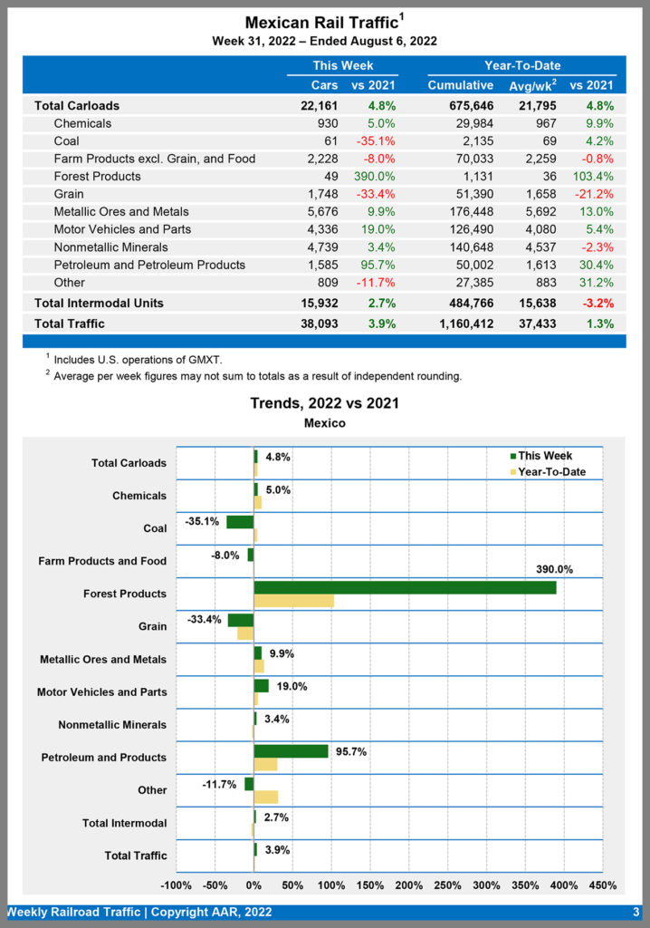 Mexican railroads reported 22,161 carloads for the week, up 4.8% compared with the same week last year, and 15,932 intermodal units, up 2.7%. Cumulative volume on Mexican railroads for the first 31 weeks of 2022 was 1,160,412 carloads and intermodal containers and trailers, up 1.3% from 2021.