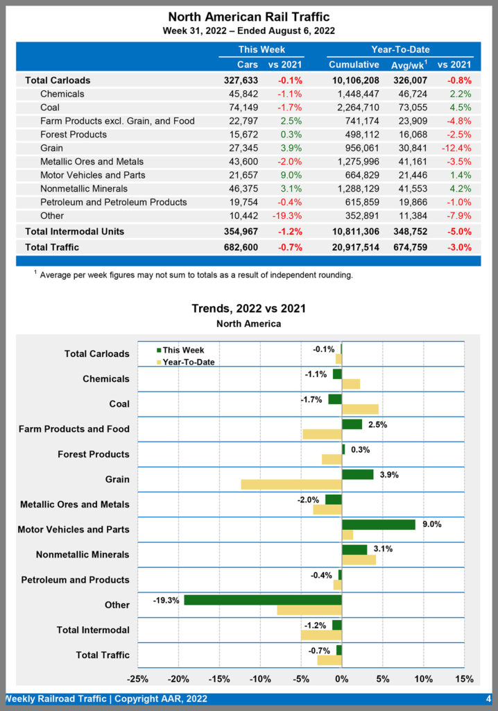North American rail volume for the week ending August 6, 2022, on 12 reporting U.S., Canadian and Mexican railroads totaled 327,633 carloads, down 0.1%, and 354,967 intermodal units, down 1.2%. Total combined weekly rail traffic in North America was 682,600 carloads and intermodal units, down 0.7%. North American rail volume for the first 31 weeks of 2022 was 20,917,514 carloads and intermodal units, down 3% compared with 2021.